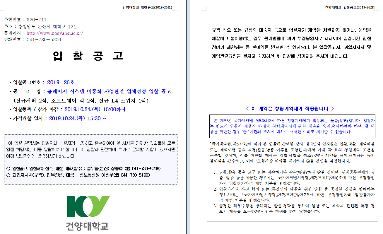 | 제목 | 2019-26호 홈페이지 시스템 이중화 사업관련 업체선정 입찰 공고 | ||||